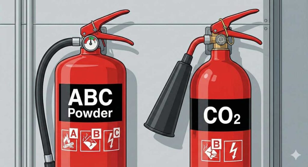 - Warning: Never use ABC powder on sensitive electronics (like PLC panels) as the residue creates a crust that ruins the circuit. Use CO2 (BC) instead.
